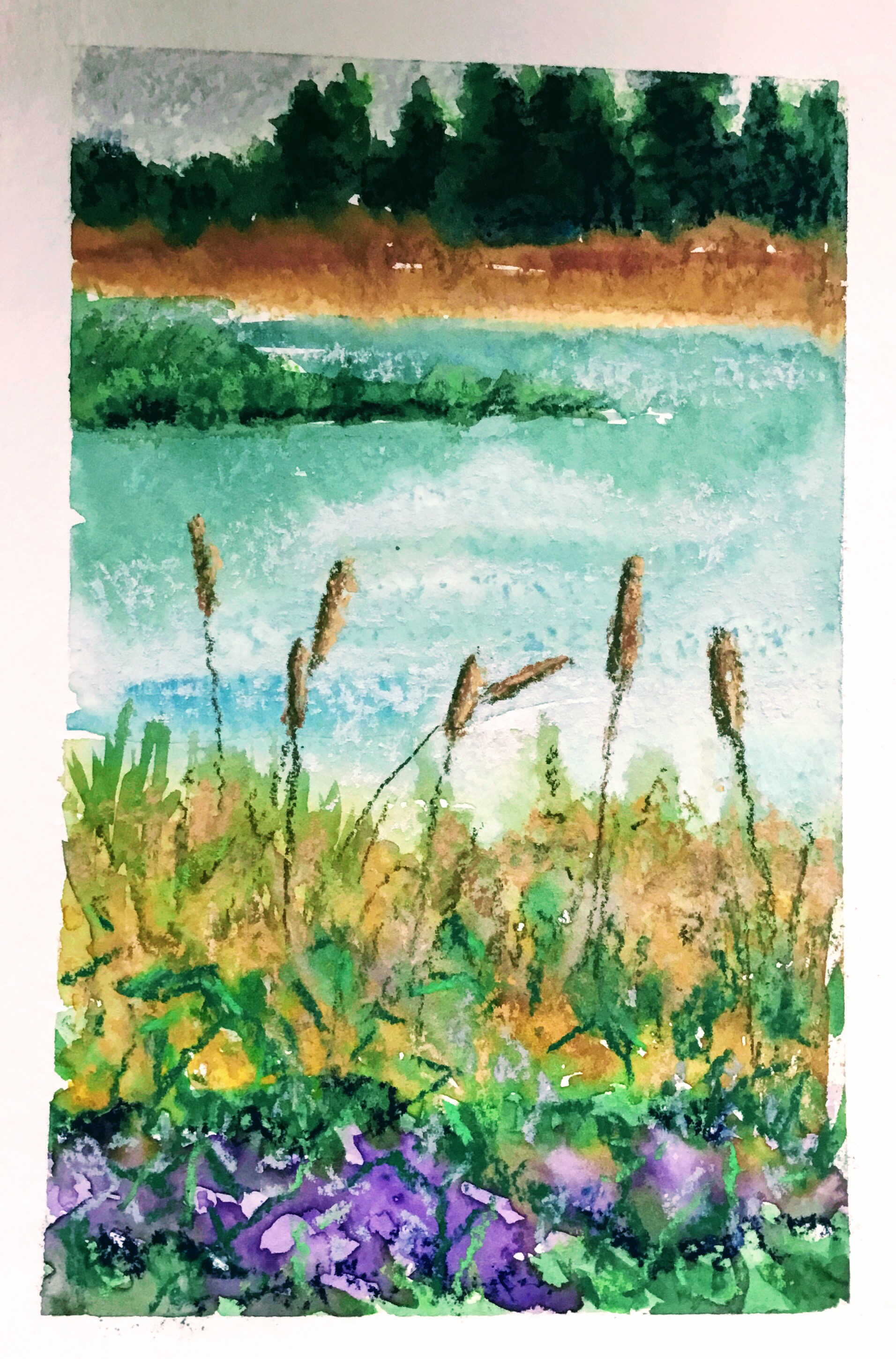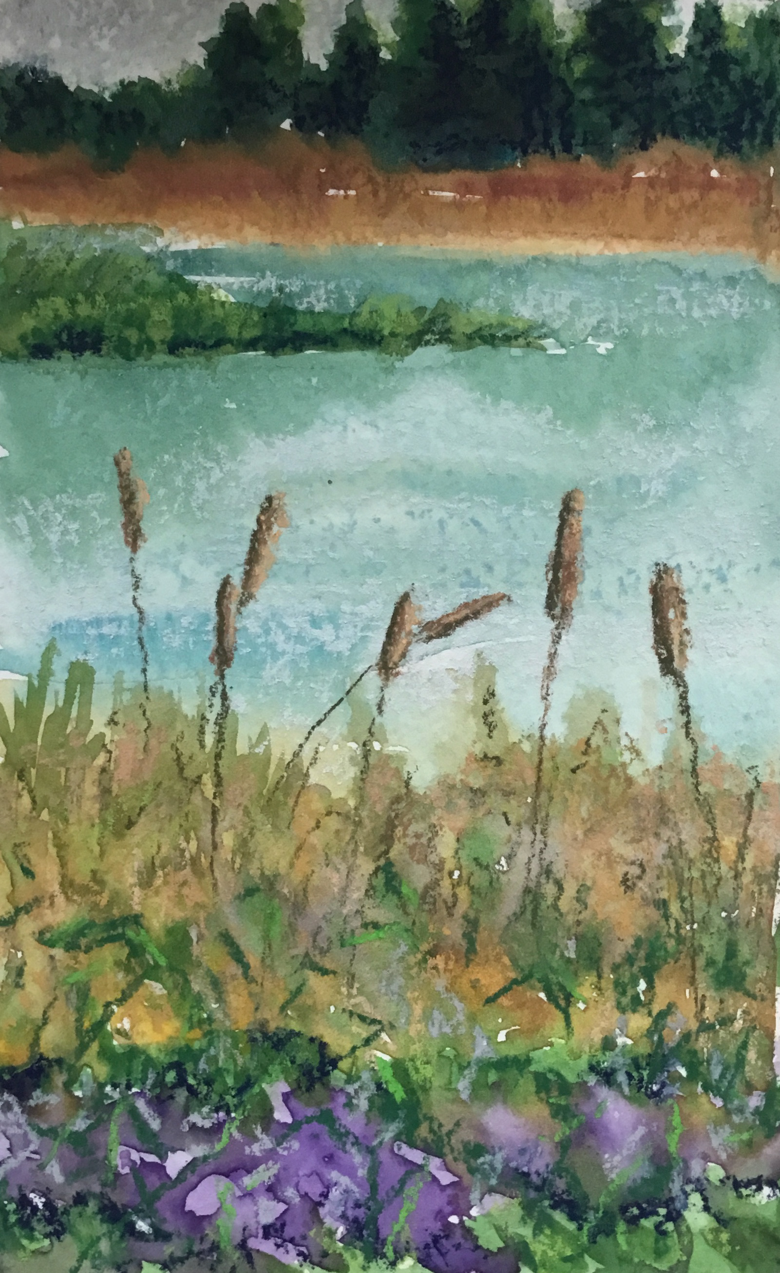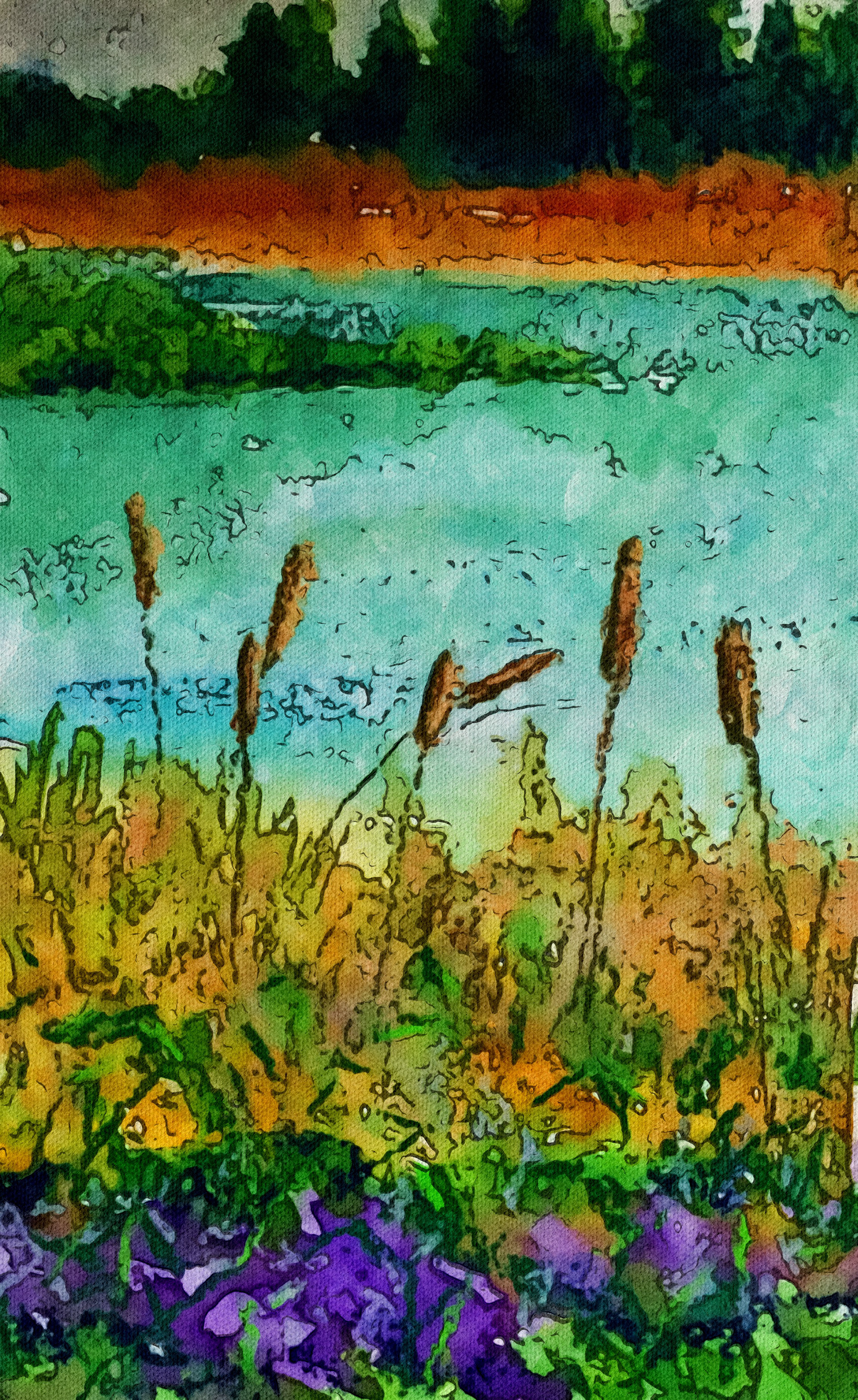 Watercolor Digital Painting of a pond with cat’o-nine tails.